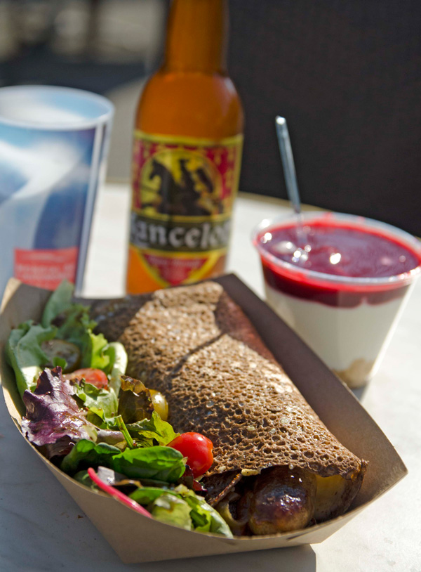Galette de sarrasin, emmental, comté, saucisse bretonne, moutarde de Meaux, confit d’oignons + salade et vinaigrette maison