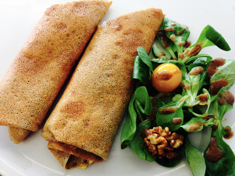 Galette de sarrasin, emmental, comté, fromage de chèvre, brie de Meaux + salade et vinaigrette maison